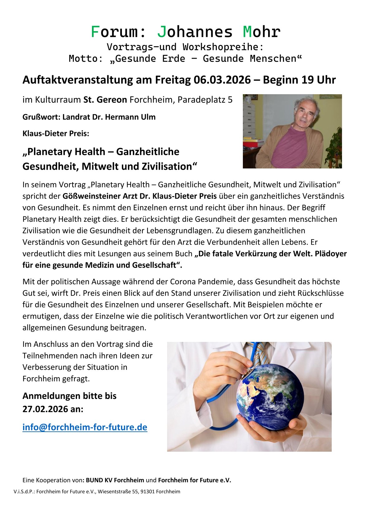 - Freitag, 6. März um 19 Uhr im Rahmen des Forum Johannes Mohr in St. Gereon: Vortrag: „Planetary Health – Ganzheitliche Gesundheit, Mitwelt und Zivilisation“. Es gibt eine neue Kooperation von BUND KV Forchheim und Forchheim for Future e.V. unter dem Motto: Gesunde Erde – Gesunde Menschen. Vorgesehen ist eine Vortrags- und Workshop-Reihe zu Nachhaltigkeitsthemen. Den Auftakt bildet der Vortrag mit Lesung von Dr. med. Klaus-Dieter Preis. Ein Grußwort wird Landrat Dr. Hermann Ulm sprechen. Im Anschluss an den Vortrag sind die Teilnehmenden nach ihren Ideen zur Verbesserung der Situation in Forchheim gefragt. Anmeldungen werden erbeten bis 27.02.2026 an: info@forchheim-for-future.de