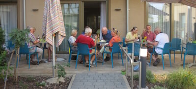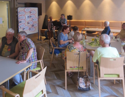 Die musikalische Begleitung durch Bernhard & Johann war angenehm und abwechslungsreich. Immer wieder gab es Momente zum Zuhören, Mitsingen, die Musik, Anknüpfungspunkte im Gespräch und Zerstreuung. Kommunikation fand außerdem mit wechselnder Besetzung an den kleinen Tischen im Hof statt. So entstand eine Atmosphäre von gemütlichem Beisammensein in Gruppen oder auch ein Miteinander. Ein gelungener Nachmittag, inspirierend, erholsam und gemütlich.